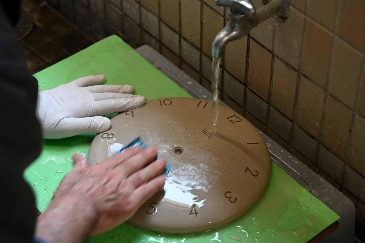 這是我們矽藻土時鐘系列的第三部作品,以「水洗面」工藝製作。這種工藝常用於抹灰工的牆面裝飾。
