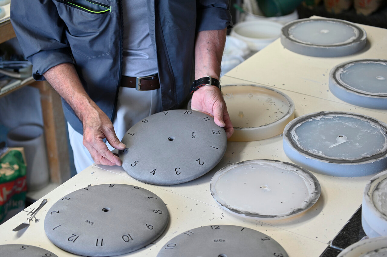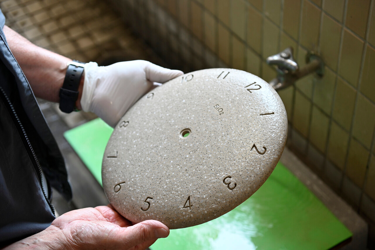 時鐘柔和的弧形設計在表面營造出光影漸變的效果,更加凸顯了無數石塊的紋理。在不損傷刻有鐘面數字邊緣的情況下,將石頭表面清洗乾淨是一項精湛的技藝,只有土壤工匠們才能憑藉細膩的手藝完成。