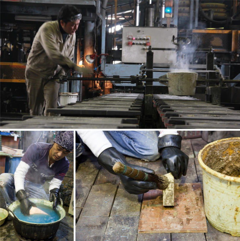 每種顏色均採用高岡傳統的米糠燒製朱紅色銅器著色工藝製成。斑駁的黑色是透過化學藥劑和高溫處理,使銅表面呈現斑駁紋理,然後再進行黑色染色而實現的。斑駁的純銀色是透過鍍純銀工藝實現的。斑駁的氣銅色則是經由銅綠的形成,再與氨氣反應而達成的。